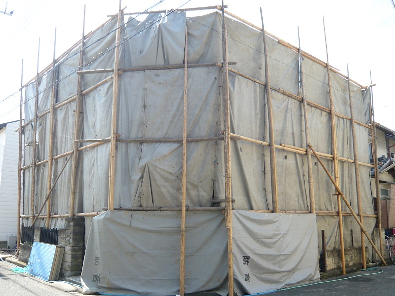 まずは足場、養生の組み立てから・・・